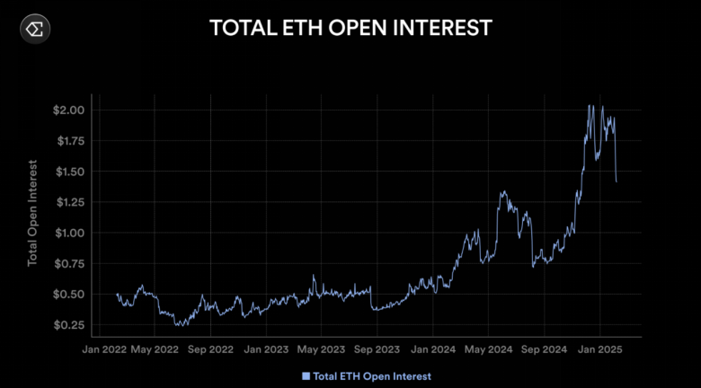 一周内,ETH未平仓合约减少超过50亿美元,周跌幅超过25%。
