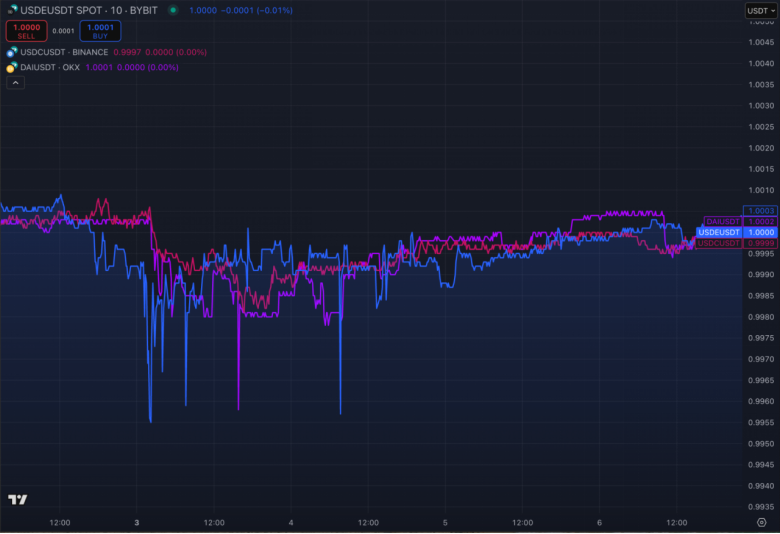 USDe、USDC(红色)和DAI(紫色)价格对比
