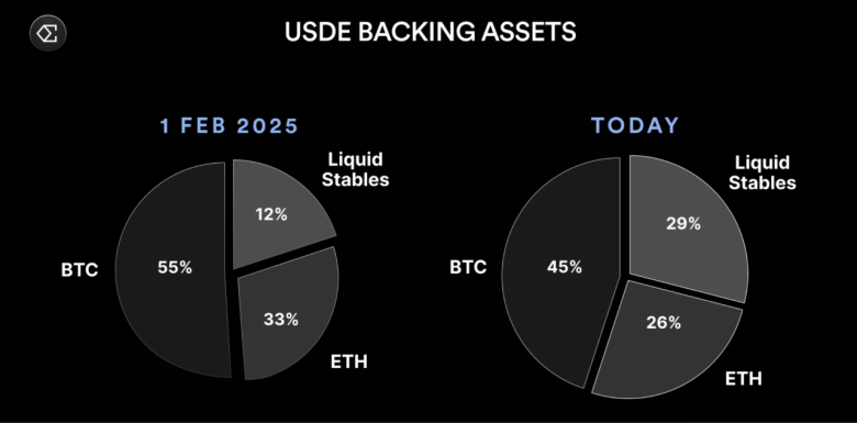 Ethena动态的资产配置方法体现在以下2月初与今天的担保资产对比中。USDe现在由近18亿美元的流动性稳定币担保,占担保资产的29%,其中一些稳定币的收益率高于永续合约的资金费率。只要这些永续合约表现不够好,Ethena就会继续配置到流动性稳定币,并优化支持USDe的资产。